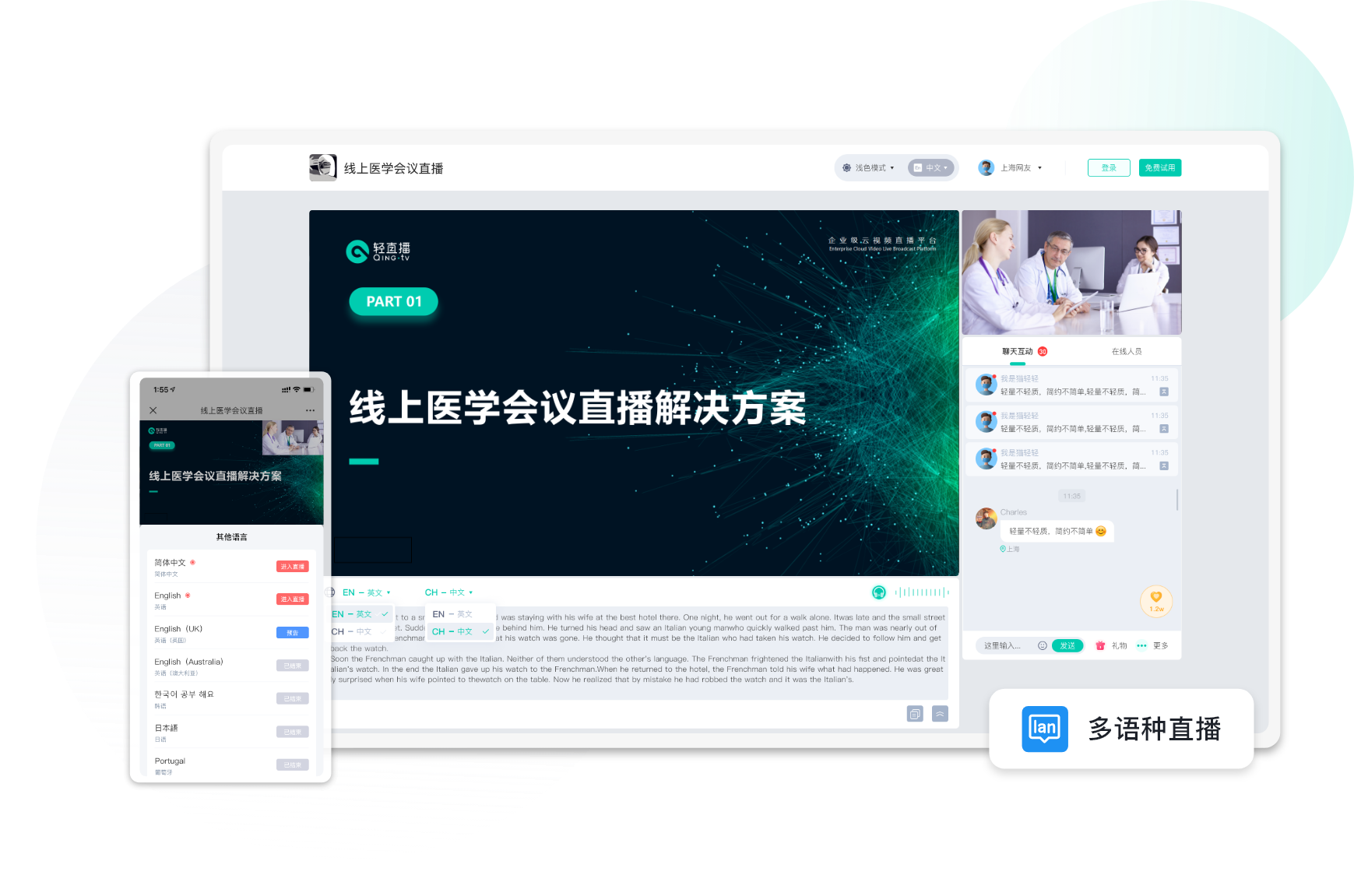 針對全球語言溝通問題,支持多語種直播、實時傳譯字幕,讓醫學交流無障礙